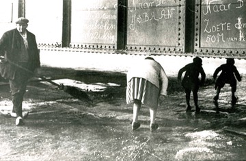 Piet Poelgeest ("bolle Jan") als ijsmeester bij de oude spoorbrug over de Liede. (ontvangen van R.v.d.Sluis uit het archief van de Historische Werkgroep Spaarndam een foto gemaakt door Sikke Jellema)