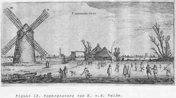 Pennincks-veer in de winter, met schaatsers. Met molen en Tolhek. Kopergavure van E. v.d. Velde. Penningsveer.