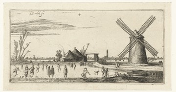 Schaatsers op het ijs bij een molen in de buurt van Penningsveer,
